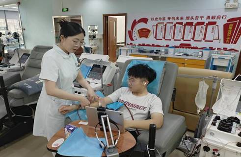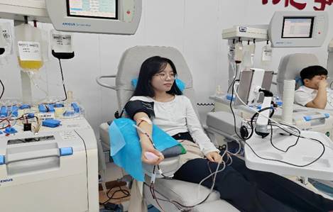 捐献血小板,是救死扶伤志愿奉献行为,在市血液中心采血大厅,志愿者经过体检、采样、血小板检测、上机献血、留观等流程,整个捐献过程长达1.5h,共有10名同学集体完成献血,他们中既有多次参加义务献血的“热血青年”,也有第一次参加义务献血的“志愿新人”,共同用实际行动诠释了汇聚青春正能量,义务献血传爱心的使命担当。