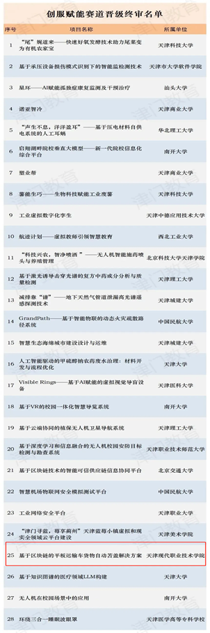 近日,由市委教育工委、市教委、市科技局、天津海河传媒中心等多部门联合举办的“天开杯”创聚津门全国大学生智能科技创新创业挑战赛公布终审入围名单,我校项目“基于区块链的平板运输车货物自动苫盖解决方案”,经过网评、初赛、复赛等多层环节,最终入围,获得创服赋能赛道终审资格。此外,大连海事大学和安徽财贸职业学院受我校邀请参赛,共有3个项目晋级创业实践主赛道终审。