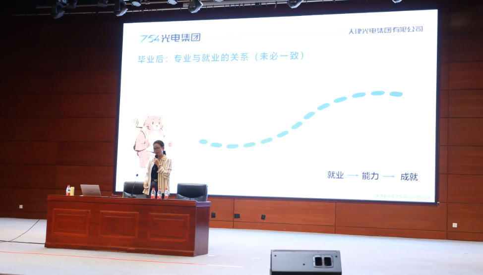 在报告会上,天津光电集团有限公司李媛媛书记首先结合天津光电集团的发展历程,通过企业的岗位及职业发展道路为学生展示了一节生动的职业生涯规划课,她以丰富的经验和独到的见解,为在座的大学生们提供了关于职业规划的宝贵建议。她强调了热爱和兴趣在职业选择中的重要性,指出只有真正热爱并投身于某个领域,才能在其中获得长足的发展和成就。同时,她也提醒大家要关注未来的发展趋势,积极拥抱变化,不断提升自己的适应能力和创新能力。