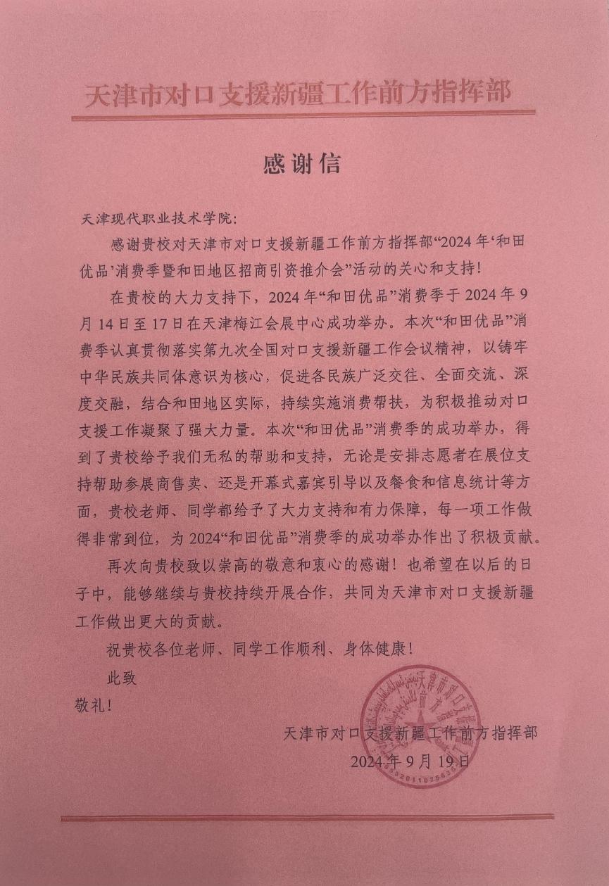 日前,接天津市对口支援新疆工作前方指挥部发来信函,对在“2024年‘和田优品’消费季暨和田地区招商引资推介会”活动期间,学院作为唯一承办单位选派大学生志愿者并圆满完成志愿服务工作表示崇高的敬意和衷心的感谢。