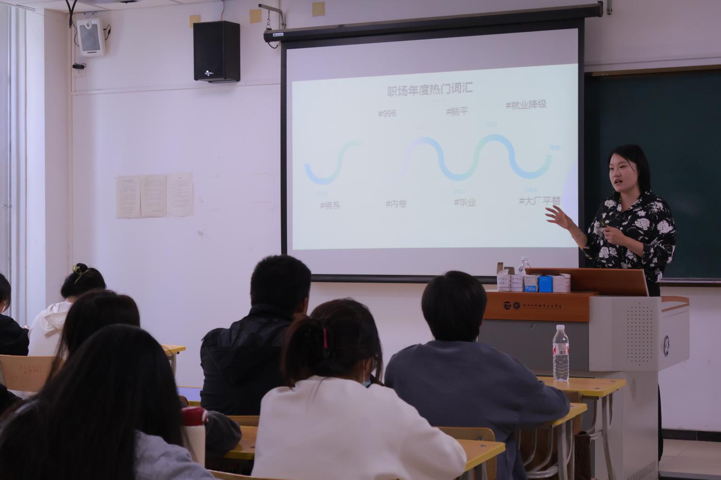 齐雅君女士首先以今年高校应届毕业生的庞大规模为切入点,用详实的数据和生动的案例,让学生们深刻认识到当前就业市场的竞争态势。她指出,面对如此激烈的竞争环境,制定科学的职业生涯规划显得尤为重要。