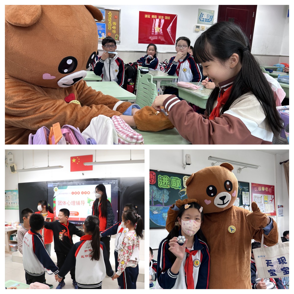昆明路小学的同学们在活动感受分享环节纷纷表示:“活动很有意思,非常喜欢小熊玩偶,通过活动我们感到很开心,很快乐,希望哥哥姐姐以后还能来!”同时,大学生志愿者和小学生们在40分钟的团辅活动中从陌生到熟悉再到依依不舍,最后志愿者们也送上了对小朋友们的祝福:“希望小朋友们好好学习,快乐成长!”团体心理辅导活动中,大学生志愿者和小学生们共同唤醒心身能量、增强积极情绪,激活幸福潜质,开启了一次心灵之旅,从“心”启航,赋能成长。