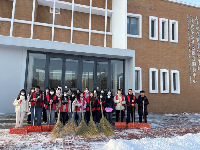 严寒没有把大家的热情击退,学工部领导老师带领学生们一起完成扫雪工作。大家戴上手套、挥动铁锹、舞动扫帚、撒盐除冰,配合默契,分工有序地投身到扫雪“战斗”中。雪水浸入鞋里,眼镜蒙上薄雾,却丝毫没有影响大家高涨的扫雪热情,通红的脸颊彰显着现代青年志愿者的风采,在冬日的校园里构成了一道亮丽的风景线。