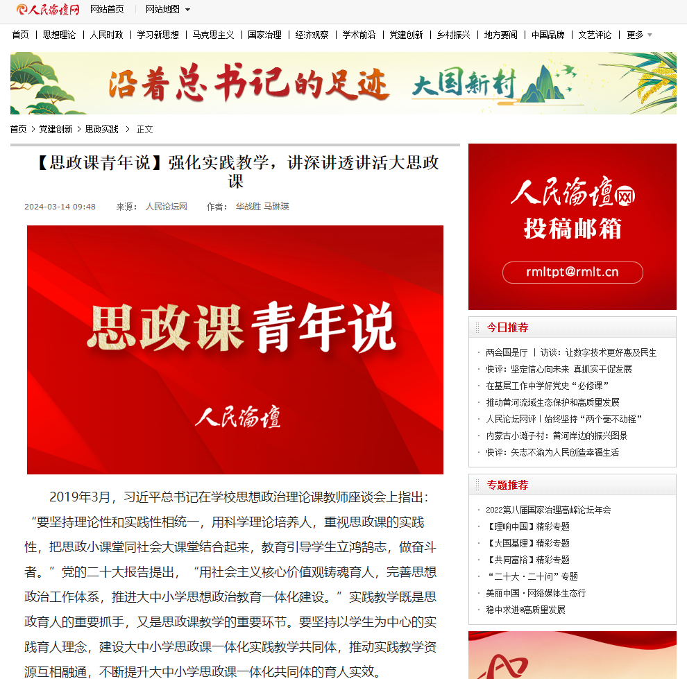 实践教学实现了思政课由教师主导到学生主体、由课堂空间到社会空间、由理论知识到实践生活的拓展,是提升思政课教学质量和实效的重要途径,也是推动大中小学思政课一体化共同体建设的重要抓手。要不断推进思政课实践教学改革,形成实践育人的长效机制,激励各学段学生用脚步丈量祖国大地,用眼睛发现中国精神,用耳朵倾听人民呼声,用内心感应时代脉搏,努力成长为堪当民族复兴重任的时代新人。(作者:best365英国在线体育官网马克思主义学院院长 华战胜,best365英国在线体育官网马克思主义学院教师 马琳瑛)