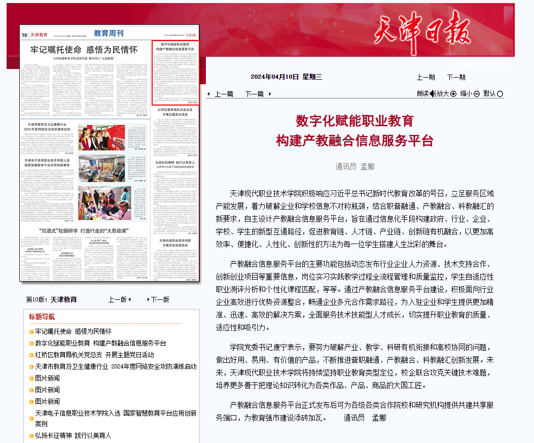 产教融合信息服务平台的主要功能包括动态发布行业企业人力资源、技术支持合作、创新创业项目等重要信息,岗位实习实践教学过程全流程管理和质量监控,学生自适应性职业测评分析和个性化课程匹配,等等。通过产教融合信息服务平台建设,积极面向行业企业高效进行优势资源整合,畅通企业多元合作需求路径,为入驻企业和学生提供更加精准、迅速、高效的解决方案,全面服务技术技能型人才成长,切实提升职业教育的质量、适应性和吸引力。