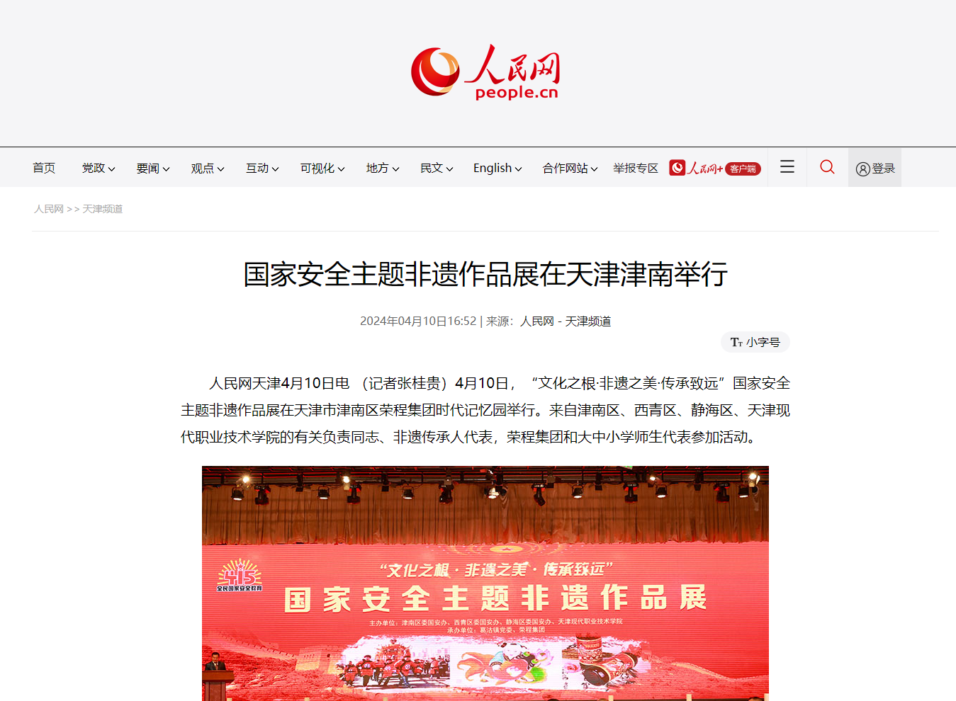人民网天津4月10日电 (记者张桂贵)4月10日,“文化之根·非遗之美·传承致远”国家安全主题非遗作品展在天津市津南区荣程集团时代记忆园举行。来自津南区、西青区、静海区、best365英国在线体育官网的有关负责同志、非遗传承人代表,荣程集团和大中小学师生代表参加活动。