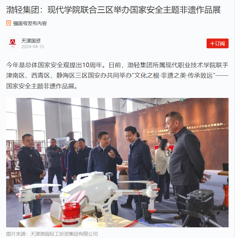 今年是总体国家安全观提出10周年。日前,渤轻集团所属现代职业技术学院联手津南区、西青区、静海区三区国安办共同举办“文化之根·非遗之美·传承致远”——国家安全主题非遗作品展。