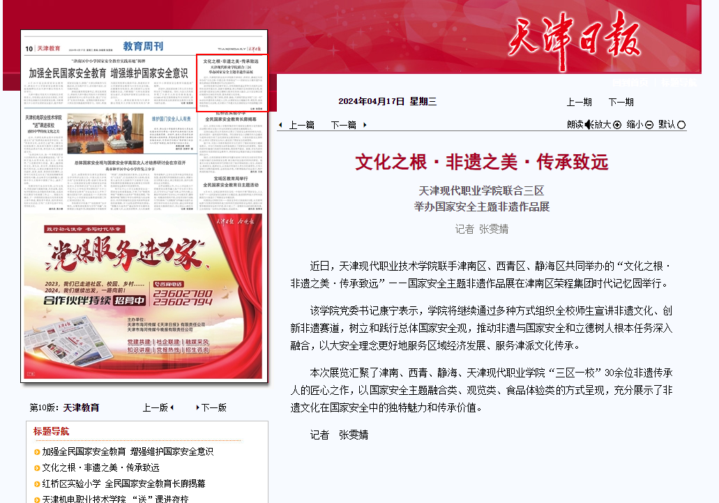 近日,best365英国在线体育官网联手津南区、西青区、静海区共同举办的“文化之根·非遗之美·传承致远”——国家安全主题非遗作品展在津南区荣程集团时代记忆园举行。