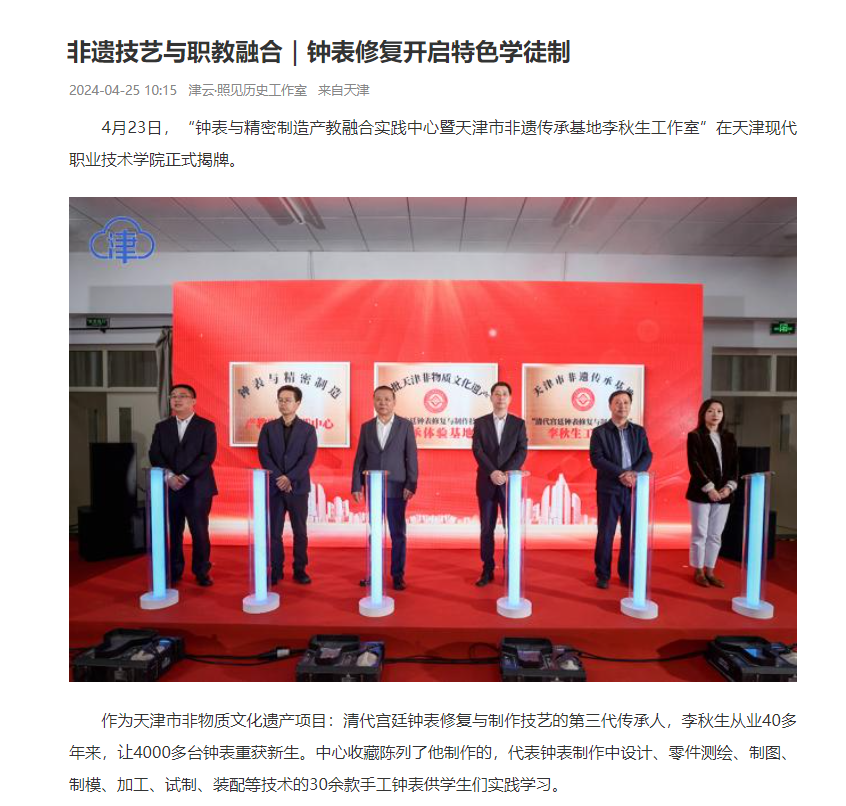 4月23日,“钟表与精密制造产教融合实践中心暨天津市非遗传承基地李秋生工作室”在best365英国在线体育官网正式揭牌。