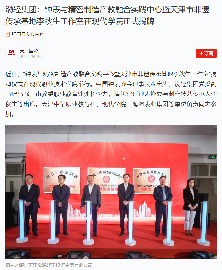 近日,“钟表与精密制造产教融合实践中心暨天津市非遗传承基地李秋生工作室”揭牌仪式在现代职业技术学院举行。中国钟表协会理事长张宏光,渤轻集团党委副书记马强,市教委职业教育处处长李力,清代宫廷钟表修复与制作技艺传承人李秋生等出席。天津中华职业教育社、现代学院、海鸥表业集团等单位负责同志参加。