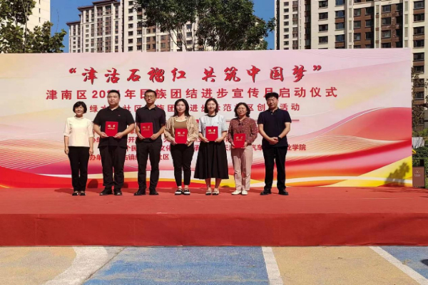 仪式上,现代学院少数民族学生为观众表演的歌舞节目《上春山》获得在场观众的阵阵掌声,为活动营造了浓厚的民族团结氛围。同时,马克思主义学院教师杨赛被津南区委统战部聘为“津南区民族团结进步宣讲团”成员。
