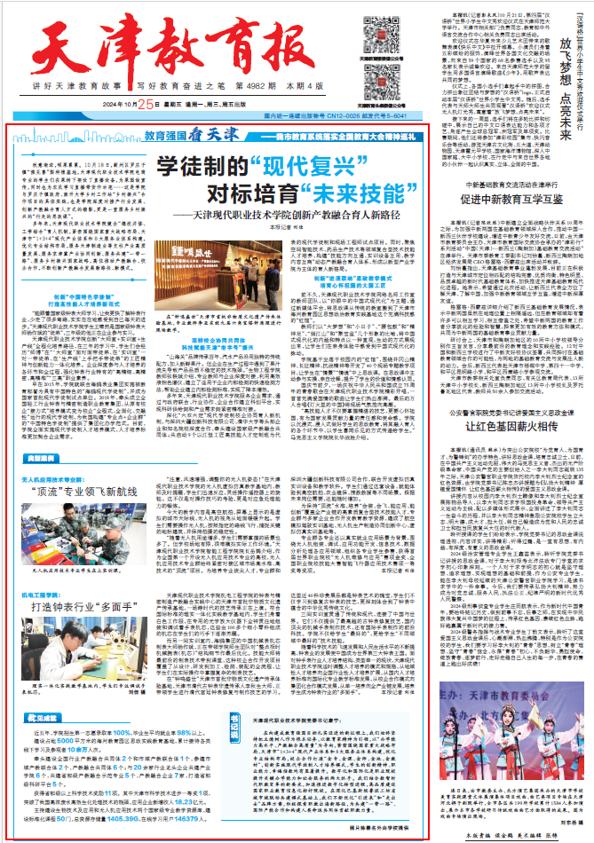 在向建成教育强国目标扎实迈进的新征程上,我们始终坚持把立德树人作为根本任务,以教育家精神为引领,以“办学能力高水平、产教融合高质量”为导向,紧密围绕国家重大战略布局、天津市“1+3+4”现代产业体系和8大服务业体系构建,优化专业结构布局,校企合作打造“金专、金课、金师、金地、金教材”,创新实施现代学徒制人才培养模式,学生的创新精神、职业能力、幸福指数均有显著提升。数字化和国际化是职业院校提升关键办学能力和社会服务的两大抓手。我们结合数智时代职教变革的新要求,加速推进数字化转型进程,高品质建设国家职业教育信息化标杆院校。在深化巴基斯坦鲁班工坊省域市域联动共建模式基础上,我们不断优化“引进来”和“走出去”品牌方案,积极探索职教出海新路径,为共建“一带一路”、国际产能合作和构建人类命运共同体贡献职教力量。
