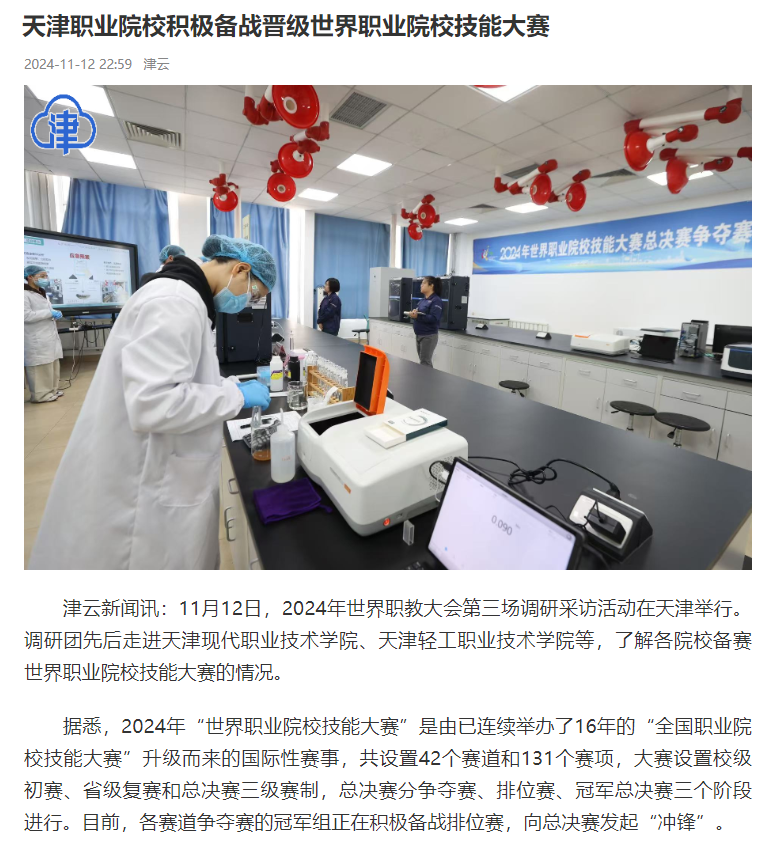 津云新闻讯:11月12日,2024年世界职教大会第三场调研采访活动在天津举行。调研团先后走进best365英国在线体育官网、天津轻工职业技术学院等,了解各院校备赛世界职业院校技能大赛的情况。