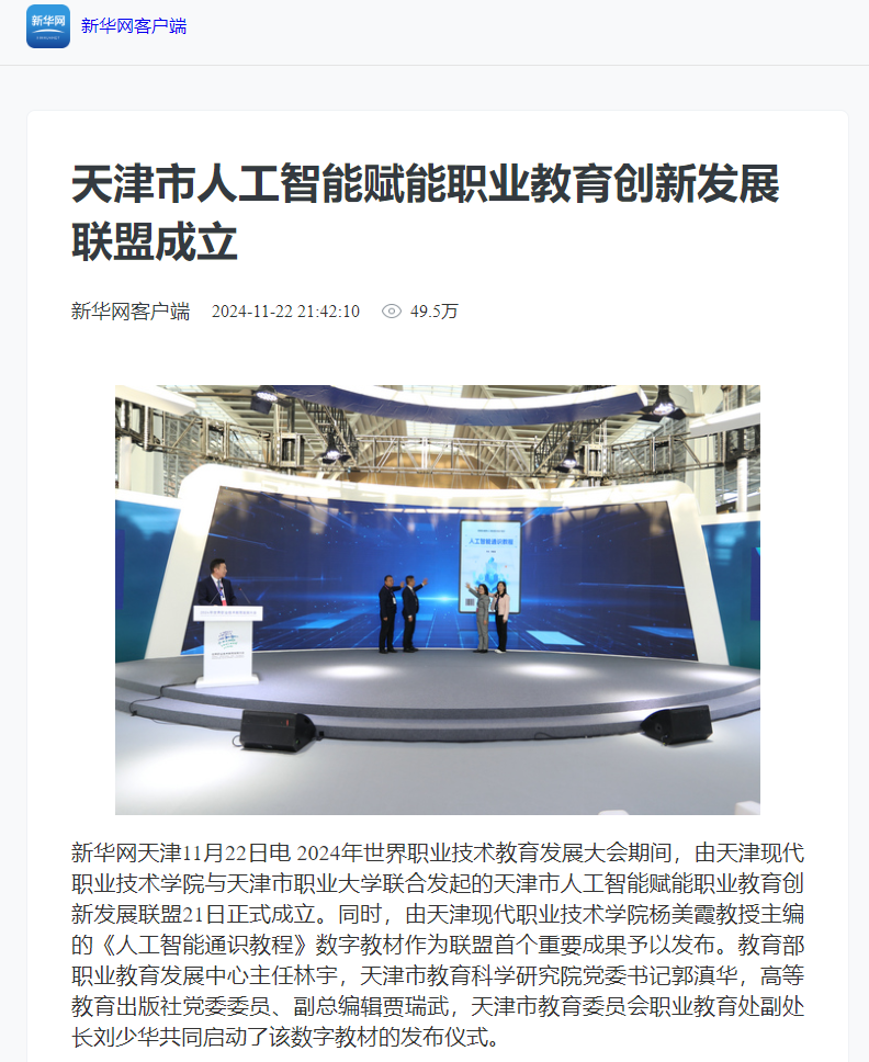 新华网天津11月22日电 2024年世界职业技术教育发展大会期间,由best365英国在线体育官网与天津市职业大学联合发起的天津市人工智能赋能职业教育创新发展联盟21日正式成立。同时,由best365英国在线体育官网杨美霞教授主编的《人工智能通识教程》数字教材作为联盟首个重要成果予以发布。教育部职业教育发展中心主任林宇,天津市教育科学研究院党委书记郭滇华,高等教育出版社党委委员、副总编辑贾瑞武,天津市教育委员会职业教育处副处长刘少华共同启动了该数字教材的发布仪式。