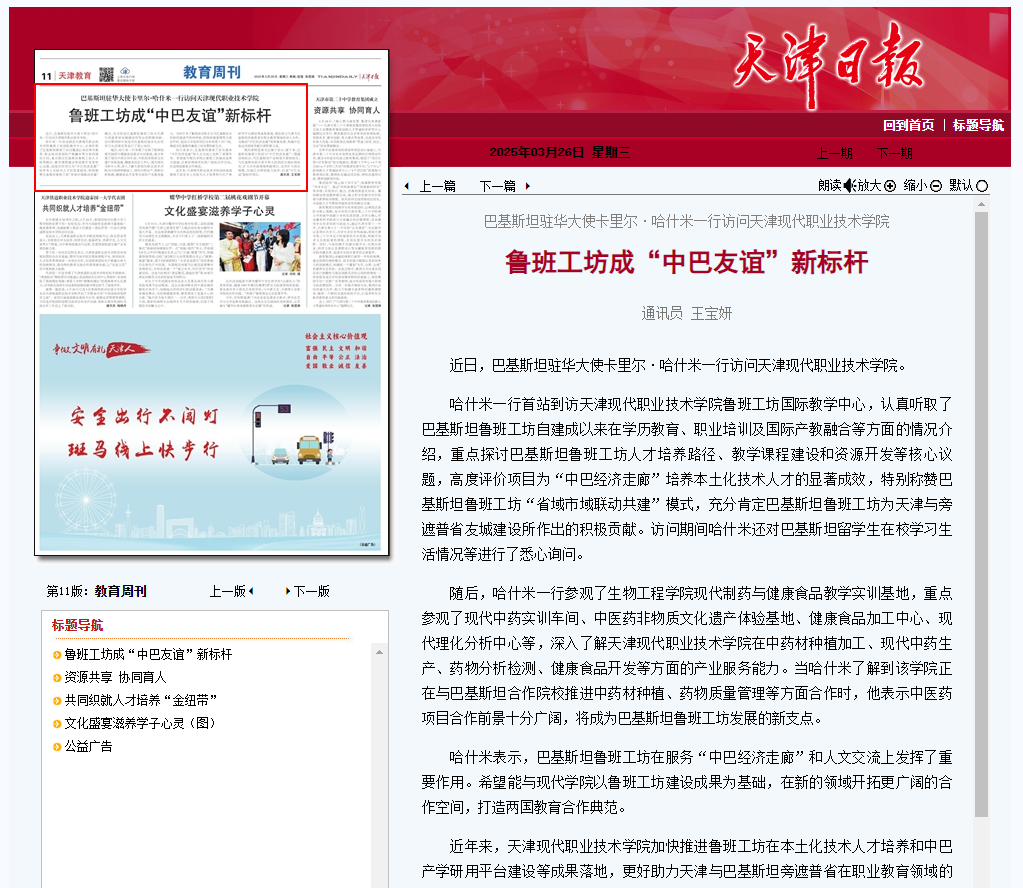 哈什米一行首站到访best365英国在线体育官网鲁班工坊国际教学中心,认真听取了巴基斯坦鲁班工坊自建成以来在学历教育、职业培训及国际产教融合等方面的情况介绍,重点探讨巴基斯坦鲁班工坊人才培养路径、教学课程建设和资源开发等核心议题,高度评价项目为“中巴经济走廊”培养本土化技术人才的显著成效,特别称赞巴基斯坦鲁班工坊“省域市域联动共建”模式,充分肯定巴基斯坦鲁班工坊为天津与旁遮普省友城建设所作出的积极贡献。访问期间哈什米还对巴基斯坦留学生在校学习生活情况等进行了悉心询问。