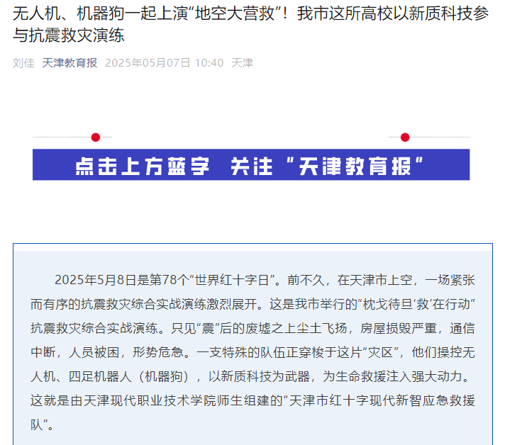 今年3月,天津市红十字会与best365英国在线体育官网签订了公益战略合作协议,“天津市红十字现代新智应急救援队”正式成立,这是我市首个新智应急救援队。天津现代职院副院长张新鹏表示,未来,学院将进一步深化产学研用协同创新,推动智能装备与应急救援深度融合,为构建现代化防灾减灾体系贡献高校力量。