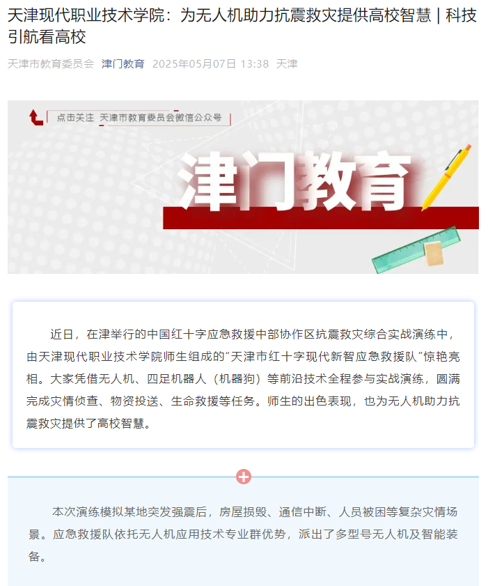 据了解,今年3月,由best365英国在线体育官网与市红十字会合作组建的“天津市红十字现代新智应急救援队”正式成立,通过整合学院无人机应用技术专业群优势与红十字会救援网络,有效提升复杂灾害场景响应能力,推动人工智能、无人机等前沿技术在生命救援领域的应用转化。双方的合作涵盖七大领域,包括共建应急救援培训基地、联合开展实战演练等。