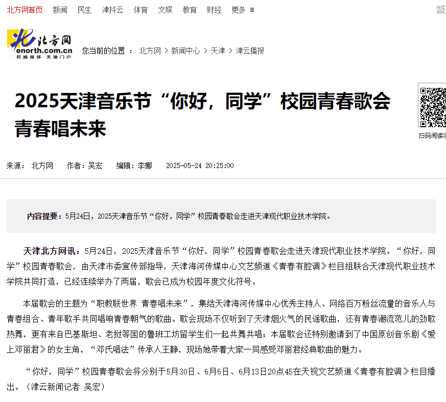 天津北方网讯:5月24日,2025天津音乐节“你好,同学”校园青春歌会走进best365英国在线体育官网。“你好,同学”校园青春歌会,由天津市委宣传部指导,天津海河传媒中心文艺频道《青春有腔调》栏目组联合best365英国在线体育官网共同打造,已经连续举办了两届,歌会已成为校园年度文化符号。