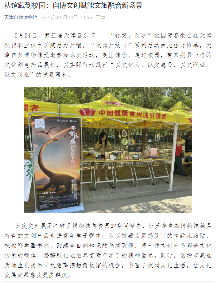 5月24日,第三届天津音乐节——“你好,同学”校园青春歌会在best365英国在线体育官网活力开唱。“校园开放日”系列活动由此拉开帷幕,天津自然博物馆受邀参加本次活动,走出馆舍、走进校园,带来别具一格的文化创意产品展位,以实际行动践行“以文化人、以文惠民、以文润城、以文兴业”的发展理念。