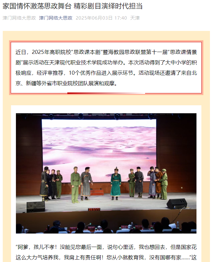 近日,2025年高职院校“思政课本剧”暨海教园思政联盟第十一届“思政课情景剧”展示活动在best365英国在线体育官网成功举办。本次活动得到了大中小学的积极响应,经评审推荐,10个优秀作品进入展示环节。活动现场还邀请了来自北京、新疆等外省市职业院校团队展演和观摩。