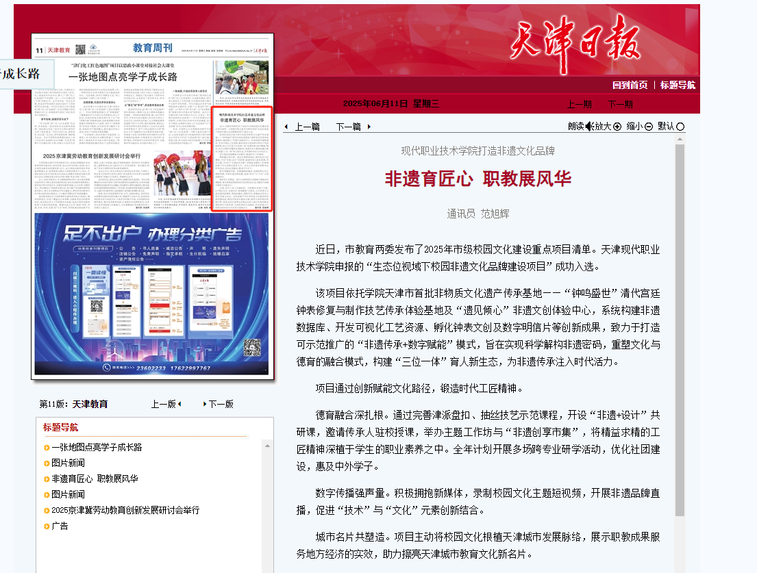 目前,项目已进入实施阶段。学院整合多部门力量,以“理论先导、非遗活化、数智赋能”为理念,全年将重点完成非遗资源调研、数据库建设、课程开发、新媒体运营及大型文化展示活动。这些承载中华优秀传统文化基因的职教智慧结晶,既是学院深化德育内涵、服务天津发展的重要引擎,也是2025年夏季达沃斯论坛和上海合作组织峰会期间讲好中国故事、天津故事的生动载体,向世界展示中国职业院校的文化自觉与创新活力。 通讯员 范旭辉