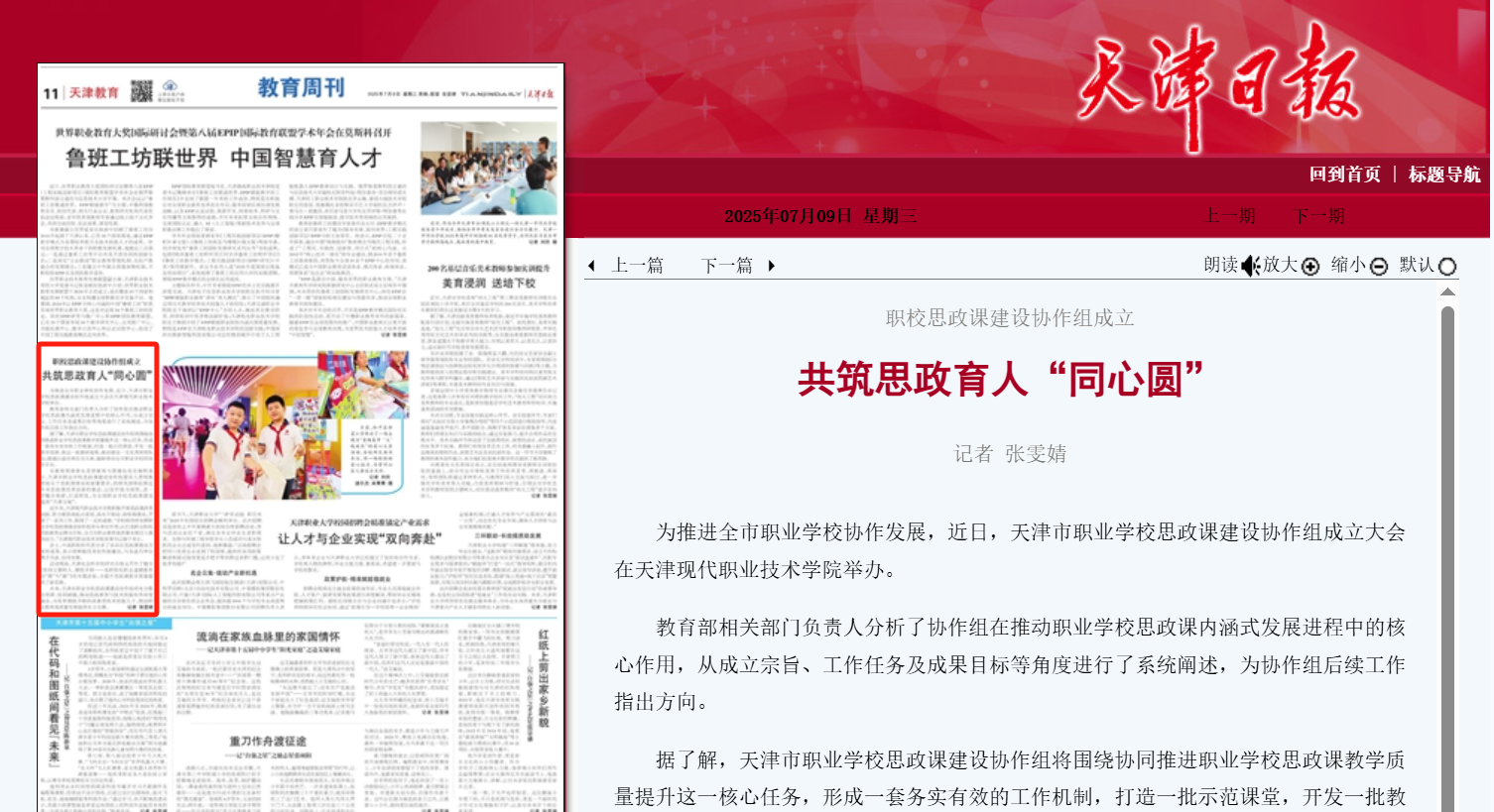 未来,天津市职业学校思政课建设协作组将充分整合资源、协同破题,推动思政教育与技术技能培养深度融合,为培育德技并修的高素质技术技能人才,推动职业教育高质量发展提供有力支撑。 记者 张雯婧
