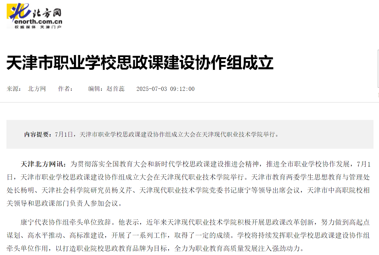 天津市职业学校思政课建设协作组的成立,是贯彻落实全国教育大会及新时代学校思政课建设推进会精神的重要实践。未来,协作组将充分整合资源、协同破题,推动思政教育与技术技能培养深度融合,为培育德技并修的高素质技术技能人才,推动职业教育高质量发展提供有力支撑。