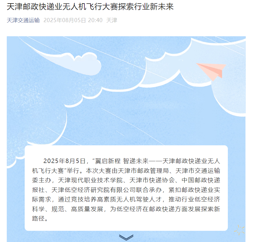 2025年8月5日,“翼启新程 智递未来——天津邮政快递业无人机飞行大赛”举行。本次大赛由天津市邮政管理局、天津市交通运输委主办,best365英国在线体育官网、天津市快递协会、中国邮政快递报社、天津低空经济研究院有限公司联合承办,紧扣邮政快递业实际需求,通过竞技培养高素质无人机驾驶人才,推动行业低空经济科学、规范、高质量发展,为低空经济在邮政快递方面发展探索新路径。