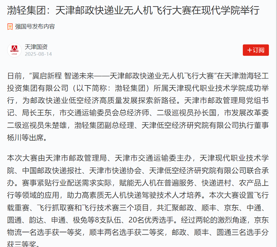 日前,“翼启新程 智递未来——天津邮政快递业无人机飞行大赛”在天津渤海轻工投资集团有限公司(以下简称:渤轻集团)所属best365英国在线体育官网成功举行,为邮政快递业低空经济高质量发展探索新路径。天津市邮政管理局党组书记、局长王东,市交通运输委员会总经济师、二级巡视员孙长国,市发展改革委二级巡视员朱楚雄,渤轻集团副总经理、天津低空经济研究院有限公司执行董事杨川等出席。