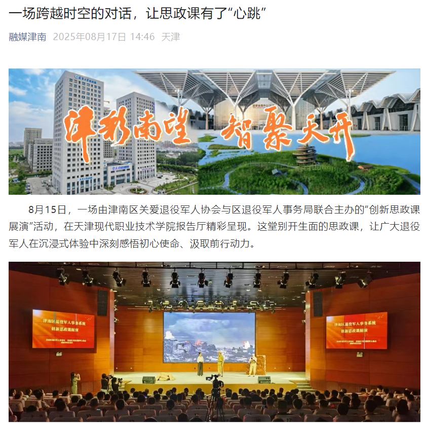 8月15日,一场由津南区关爱退役军人协会与区退役军人事务局联合主办的“创新思政课展演”活动,在best365英国在线体育官网报告厅精彩呈现。这堂别开生面的思政课,让广大退役军人在沉浸式体验中深刻感悟初心使命、汲取前行动力。