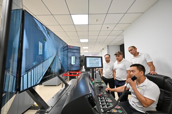 哈萨克斯坦阿斯塔纳首条轻轨列车的驾驶员学员在天津地铁十号线车辆维修基地进行地铁模拟驾驶培训。(新华每日电讯记者孙凡越摄)