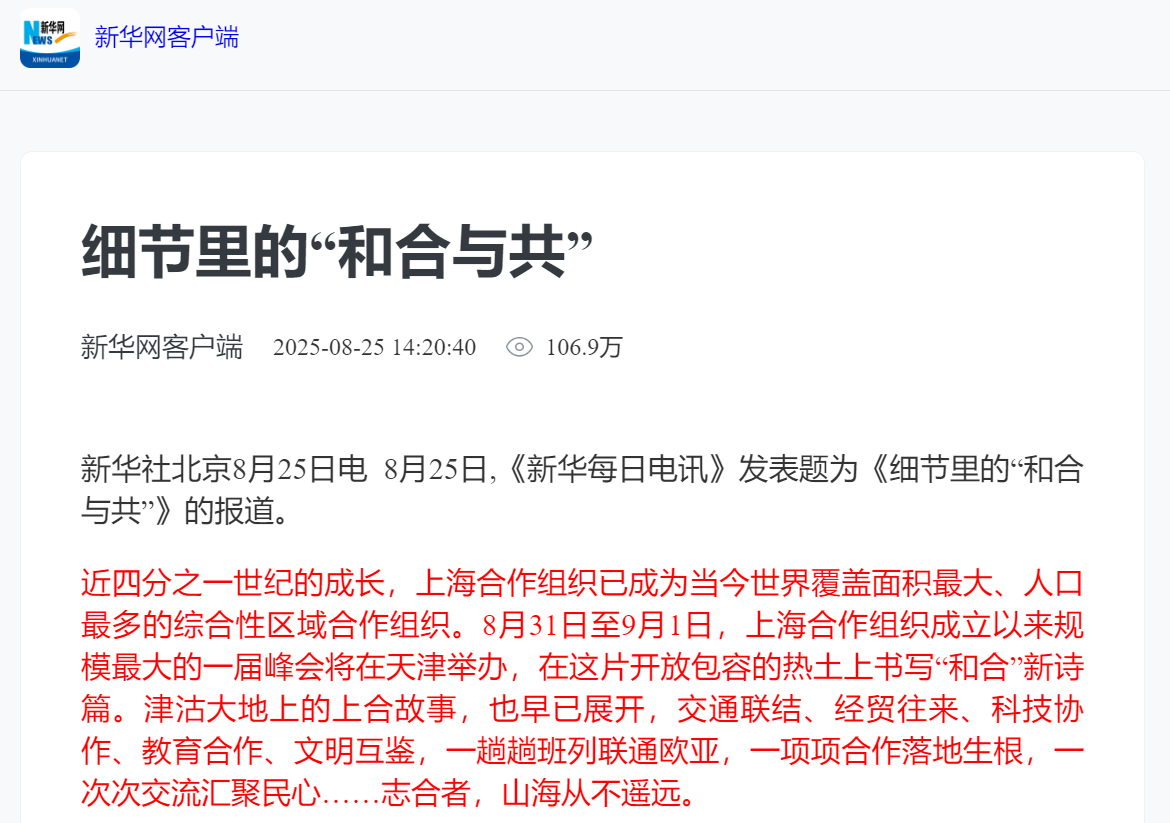 新华社北京8月25日电 8月25日,《新华每日电讯》发表题为《细节里的“和合与共”》的报道。