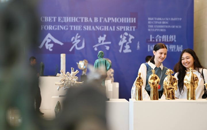 七月二十三日,嘉宾在“合光共塑”上合组织国家雕塑展上参观。新华社记者 李然 摄