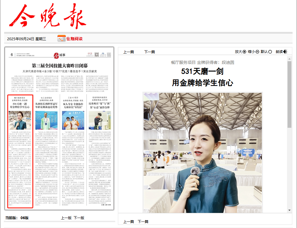 备赛期间,段迪圆常挂在嘴边的是“三个相信”:“相信专业技术的力量”——台面摆台、技能展示的每一处细节,都经过成百上千次锤炼;“相信团队的力量”——从教练组到后勤保障,基地、学校、天津市的支持让她无后顾之忧;“相信时间的沉淀”——531个日夜的专注,终让技艺与心态臻于至善。“这不是我一个人的金牌,是所有幕后英雄的共同荣誉。”她坦言。