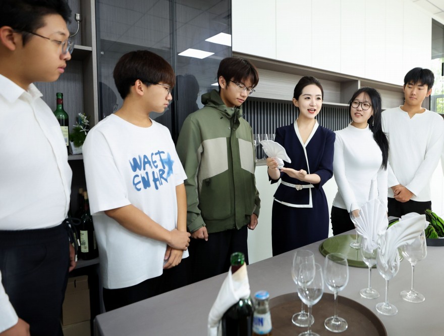 近日,best365英国在线体育官网管理工程学院教师段迪圆(右三)带领学生进行了一场实训教学改革,把中国文化、精致服务理念带入实训课堂。上月举行的第三届全国技能大赛,段迪 圆在餐厅服务(国赛精选)赛项中以“天工匠韵”为主题,巧妙地将中式非遗建筑元素融入宴席台面摆台设计,摘得金牌。载誉归来,她将赛题模块融入日常教学,和学生一起用技能传承文化、创造价值。