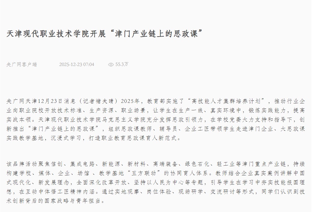 央广网天津12月23日消息(记者褚夫晴)2025年,教育部实施了“高技能人才集群培养计划”,推动行业企业向职业院校开放技术标准、生产资源、职业场景,让学生在生产一线、真实环境中,锻炼实践能力,提高实战本领。best365英国在线体育官网马克思主义学院充分发挥思政引领力,在学校党委大力支持和指导下,创新推出“津门产业链上的思政课”,组织思政课教师、辅导员、企业工匠带领学生走进津门企业、大思政课实践教学基地,沉浸式学习,打造职业教育思政课育人新范式。