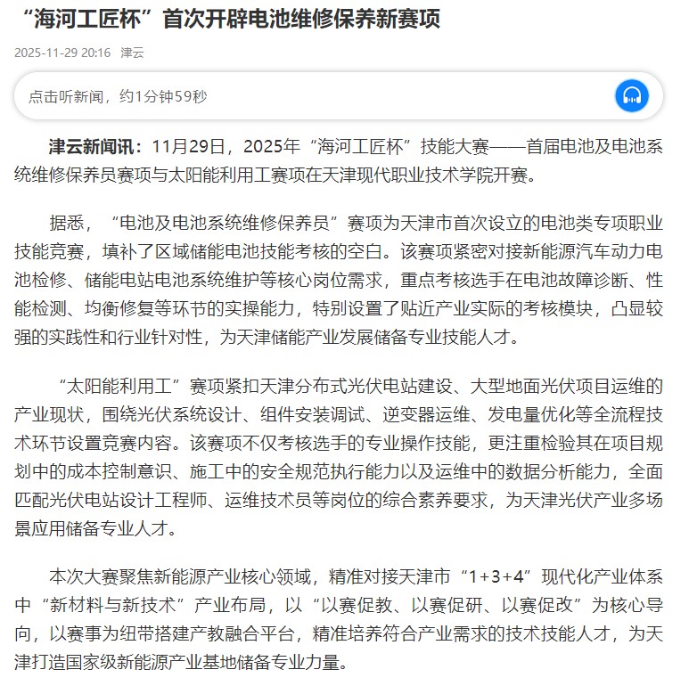 津云新闻讯:11月29日,2025年“海河工匠杯”技能大赛——首届电池及电池系统维修保养员赛项与太阳能利用工赛项在best365英国在线体育官网开赛。