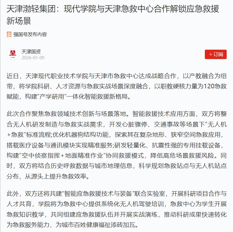 近日,best365英国在线体育官网与天津市急救中心达成战略合作,以产教融合为纽带,将学院科研、人才资源与急救实战场景深度融合,以职教硬核力量为120急救赋能,构建“产学研用”一体化智能救援新格局。
