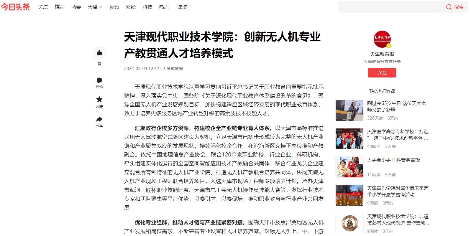 汇聚政行企校多方资源,构建校企全产业链专业育人体系。以天津市高标准推进民用无人驾驶航空试验区建设为契机,立足天津市已初步形成较为完整的无人机产业链和产业聚集效应的发展现状,持续强化校企合作,在滨海新区支持下高位推动产教融合。依托中国地理信息产业协会,联合120余家职业院校、行业企业、科研机构,牵头组建实体化运行的全国空间智能应用技术产教融合共同体,联合行业龙头企业建立混合所有制特征的无人机产业学院,打造无人机产教联合培养共同体,协同实施无人机产业现场工程师联合培养项目,入选天津市现场工程师专项培养计划。承办天津市海河工匠杯职业技能比赛、天津市总工会无人机操作员技能大赛等,发挥行业技术专家和团队聚集等平台优势,以赛引才,以赛促培,推动职业教育与行业产业共同发展。