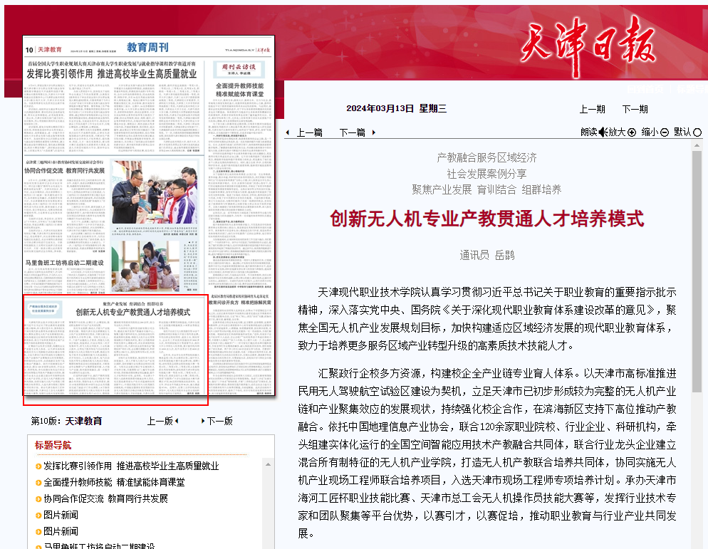 汇聚政行企校多方资源,构建校企全产业链专业育人体系。以天津市高标准推进民用无人驾驶航空试验区建设为契机,立足天津市已初步形成较为完整的无人机产业链和产业聚集效应的发展现状,持续强化校企合作,在滨海新区支持下高位推动产教融合。依托中国地理信息产业协会,联合120余家职业院校、行业企业、科研机构,牵头组建实体化运行的全国空间智能应用技术产教融合共同体,联合行业龙头企业建立混合所有制特征的无人机产业学院,打造无人机产教联合培养共同体,协同实施无人机产业现场工程师联合培养项目,入选天津市现场工程师专项培养计划。承办天津市海河工匠杯职业技能比赛、天津市总工会无人机操作员技能大赛等,发挥行业技术专家和团队聚集等平台优势,以赛引才,以赛促培,推动职业教育与行业产业共同发展。