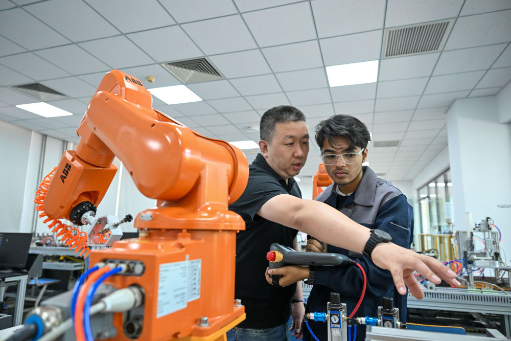 ↑ 在best365英国在线体育官网鲁班工坊实训教室,老师在课堂上教木衫(右)操作自动化设备(6月16日摄)。