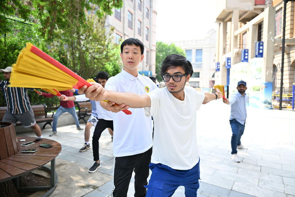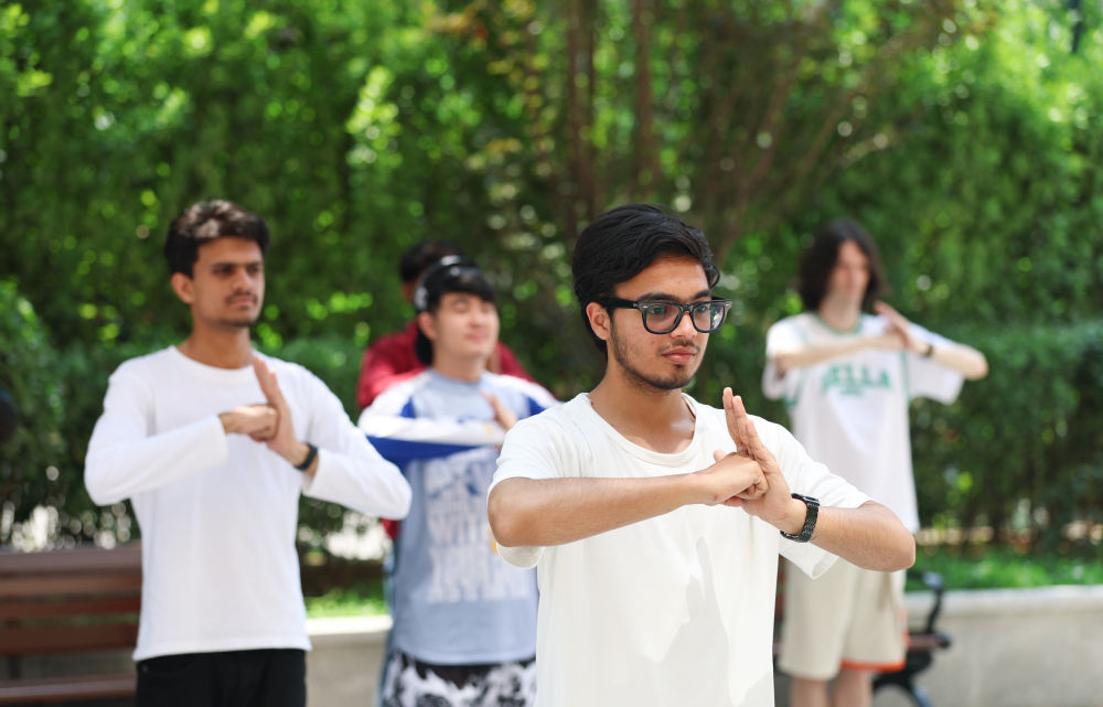 ↑ 在天津国际汉语学院,木衫(前)在学习八段锦(7月22日摄)。